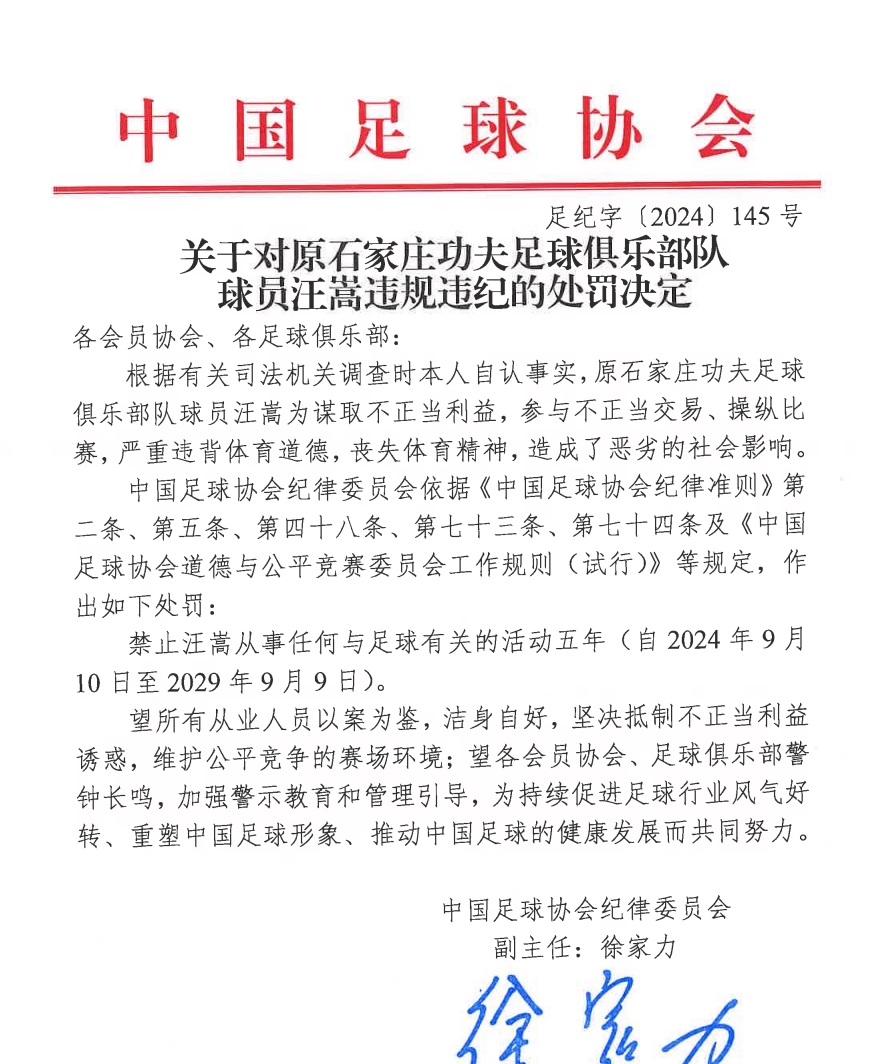 足协公布对假赌黑涉案人员的行业处罚,汪嵩为谋取不正当利益,参与不正当交易、操纵比赛,禁足5年。