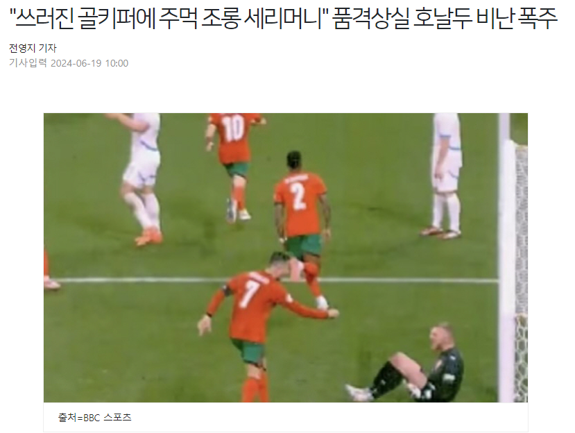 欧洲杯小组赛首轮,葡萄牙2-1击败捷克。克里斯蒂亚诺·罗纳尔多的庆祝动作引起了争议。韩媒《朝鲜体育》评论称,C罗向对方门将挥拳庆祝的方式证明了他是最不诚实的球...