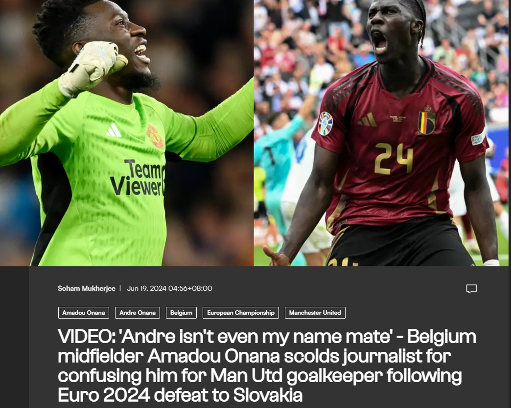 欧洲杯小组赛首轮,比利时爆冷负于斯洛伐克。赛后,比利时中场阿马杜·奥纳纳在接受采访时被现场记者误认为是曼联门将安德烈。奥纳纳,阿马杜·奥纳纳对此有些“不满”。...
