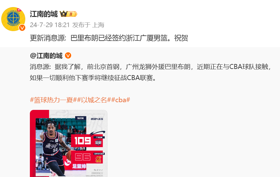 北京时间7月29日讯,根据媒体人@江南的城报道:巴里-布朗已经签约浙江广厦男篮。原文如下:更新消息源: 巴里布朗已经签约浙江广厦男篮。祝贺上赛季巴里-布朗代表广...